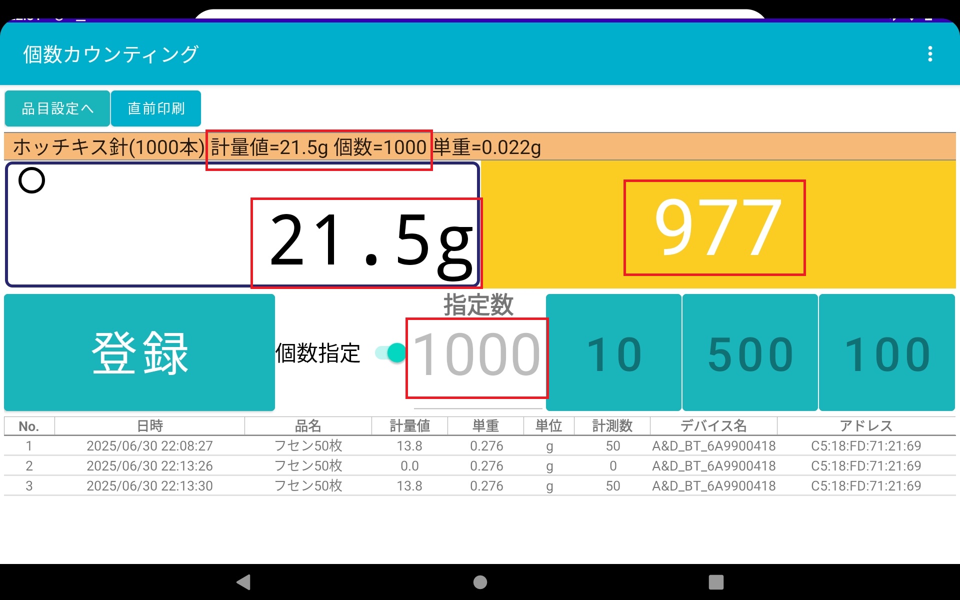 未完了[R2.1]「品目設定」で登録した品名を選択し、品目設定で設定した数(1000個)を個数指定(1000)し計数したら、「977」個と表示される